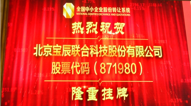 北京宝辰联合科技股份有限公司(原宝辰化学)于2017年8月8日在新三板正式挂牌上市,股票简称“宝辰联合”,股票代码871980。“新三板”的挂牌是公司成长道路上的一个重要里程碑,标志着公司正式踏入中国资本市场,公司将充分利用资本市场助推产业升级,引领:“中国制造2025”背景下,新材料智能制造的创新发展。